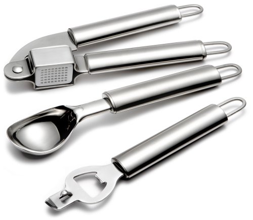 - Gadget set includes garlic press, ice-cream scoop, peeler, bottler opener, pizza cutter, and can opener- Also includes utensil stand with hanging hooks