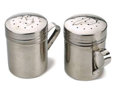 These stainless steel salt and pepper shakers are terrific to keep near the stove for quick seasoning. They have large handles, screw on lids for easy filling and hold 10 ounces. Dishwasher safe. #ST-30SP